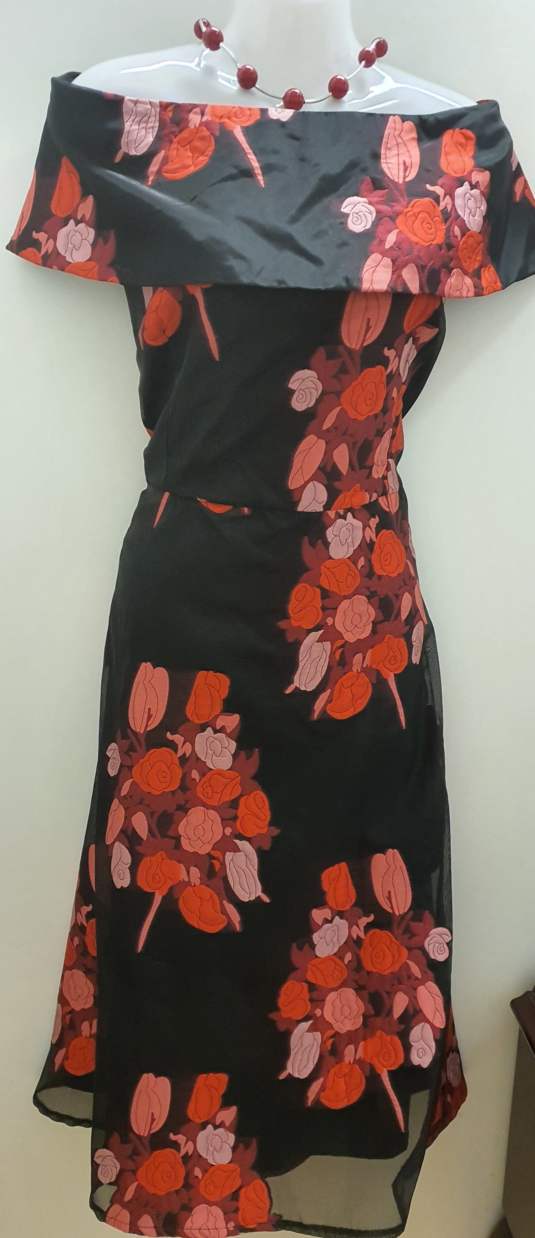 Stunning off the shoulder Dress in black embossed with a bouquet of red roses.