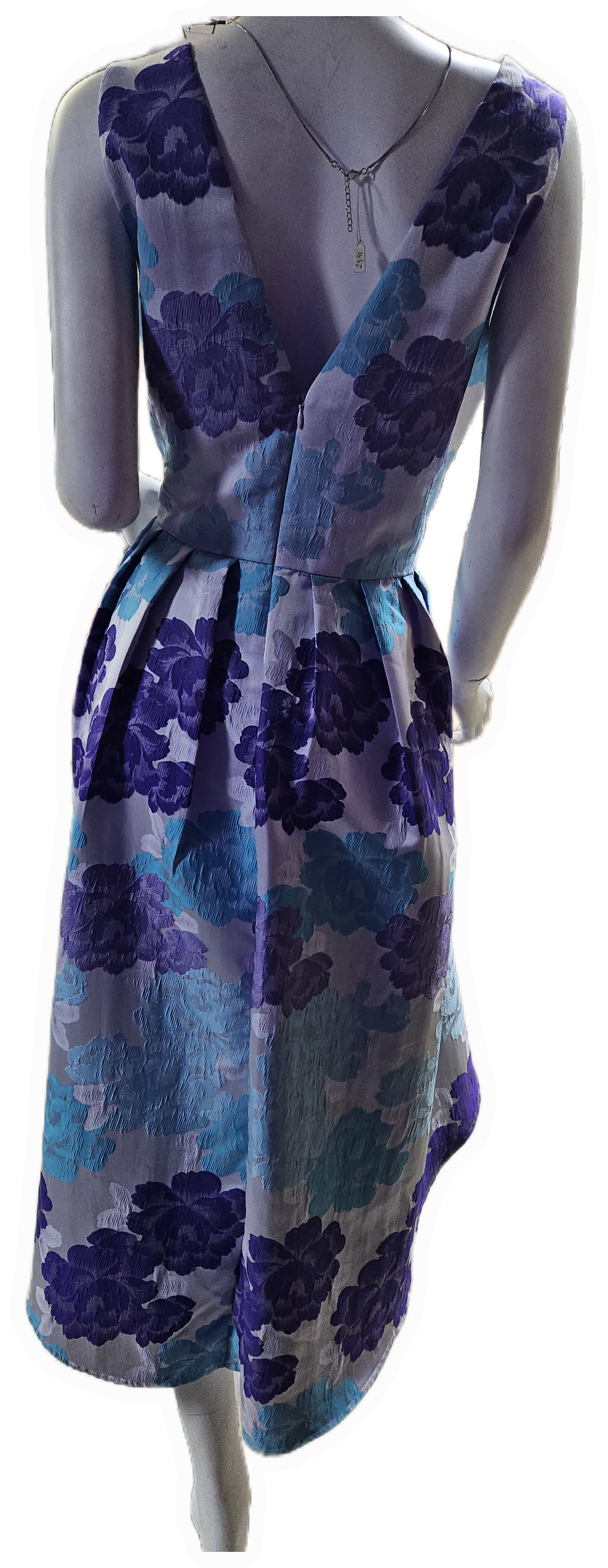 Sleeveless high low floral print dress in stunning purple and aqua blue floral prints with Silvery white background. Perfect for semi formal parties or for wedding guests.