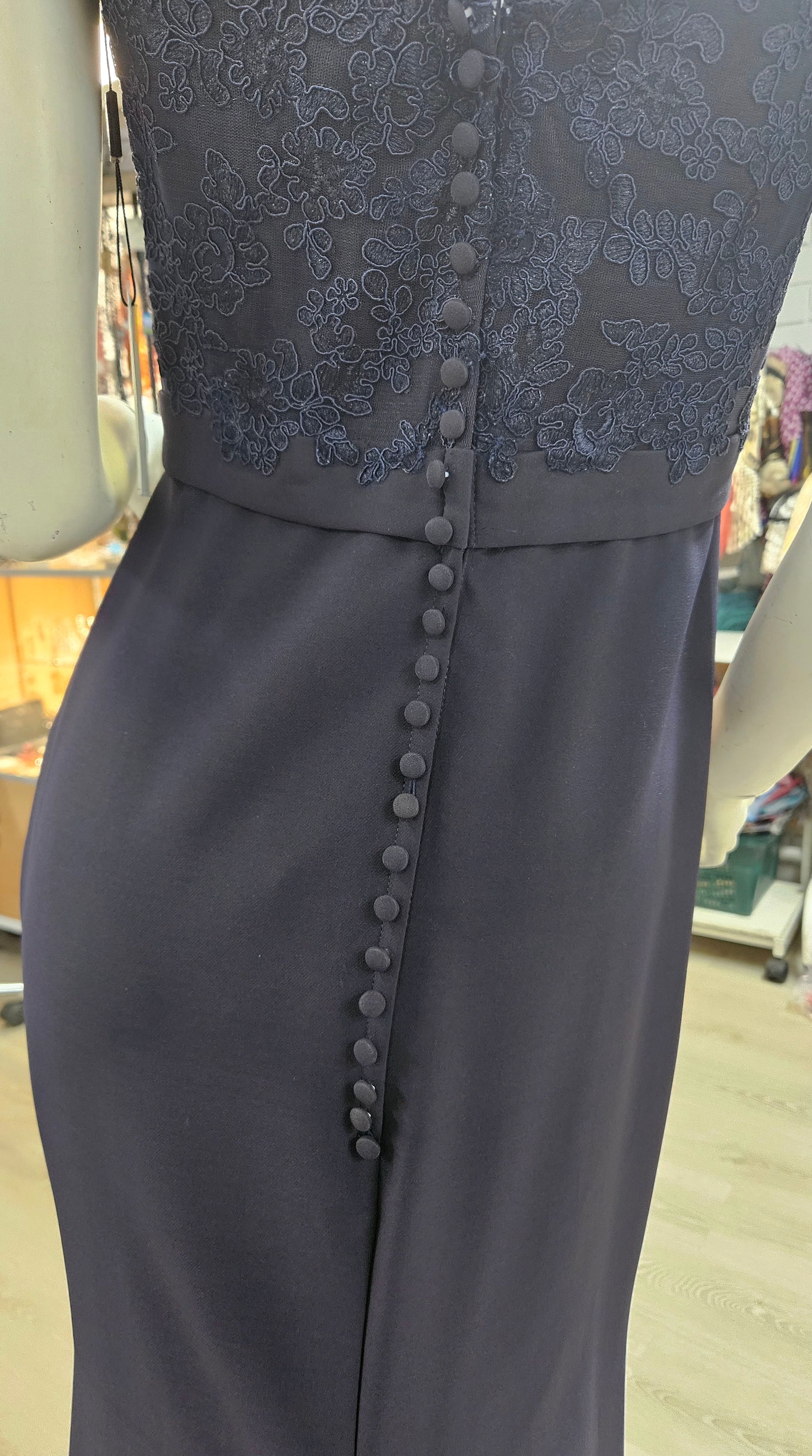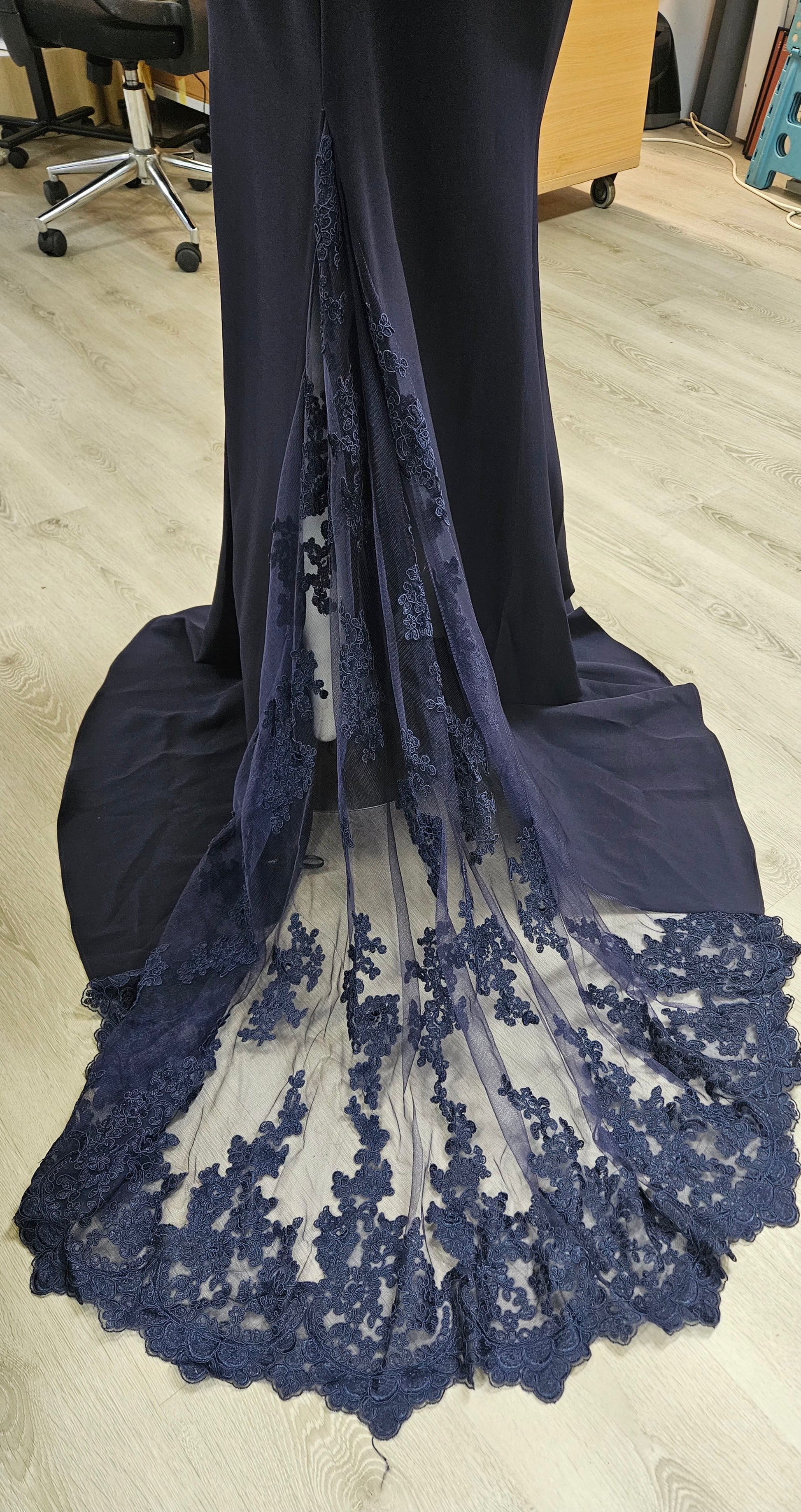 Gorgeous off shoulder formal dress in Navy from Jadore collection. Lace fishtail which can be hook at one of the lower back buttons or can be put on in one of your fingers.