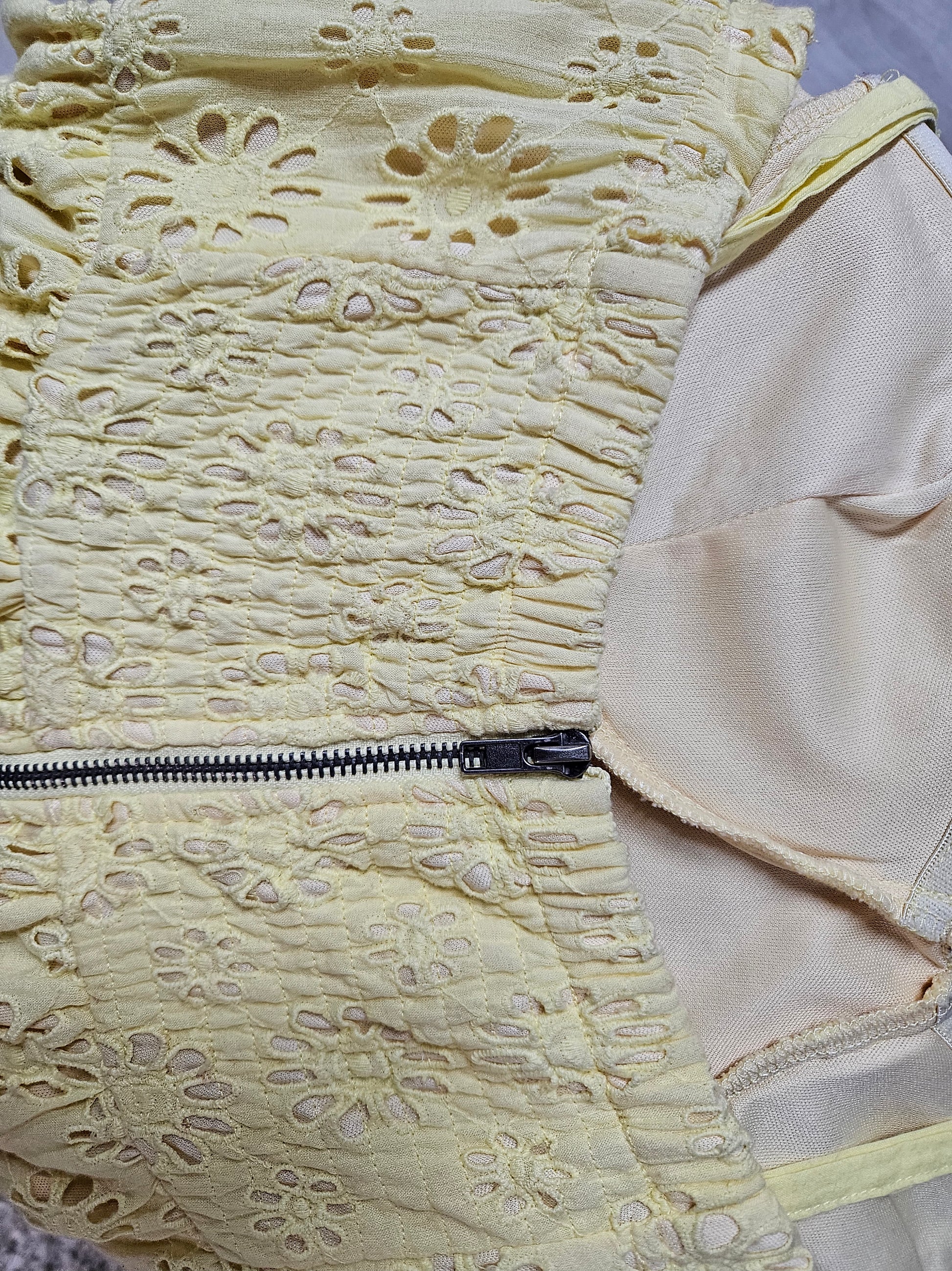 Eyelet embroidered dress. Can be worn with or without straps. Elastic back.